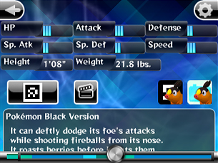 『ポケモン立体図鑑BW』の下画面にはポケモンの情報がたっぷり!! ポケモンの能力だけでなく、ソフトで表示されるのははじめてとなるタマゴグループや進化の流れの図式、覚えられる技などなどもりだくさんだ。