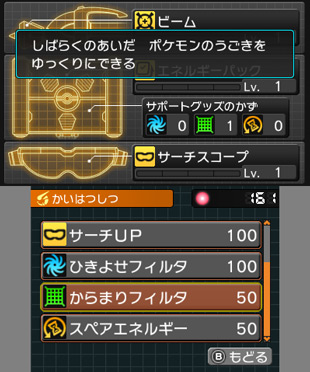 マシンの強化以外にも、使うことでポケモンを捕まえやすくする「サポートグッズ」や、ポケモンや道具を見つけやすくなる「ちょうさパーツ」があるぞ!