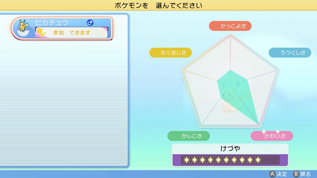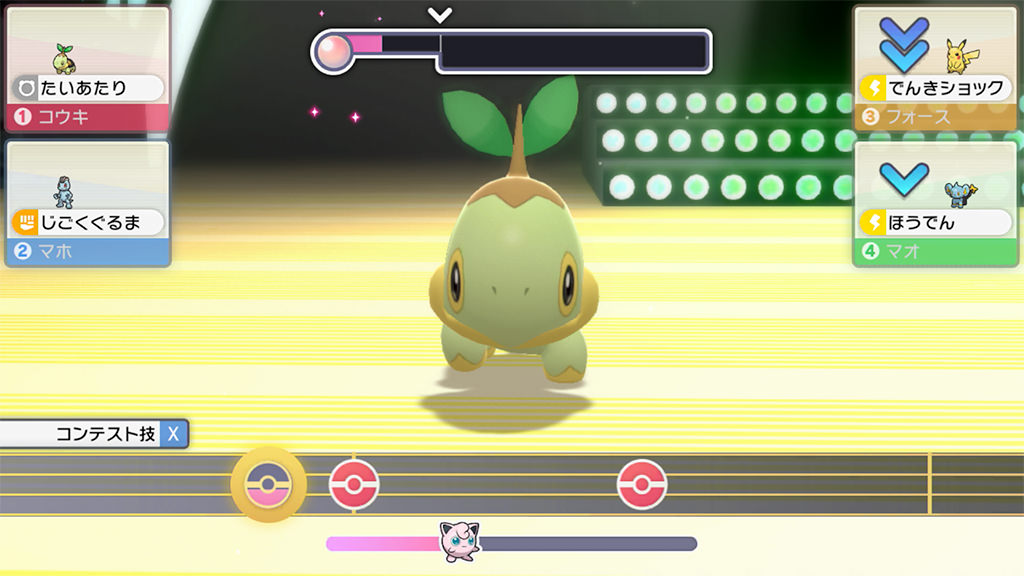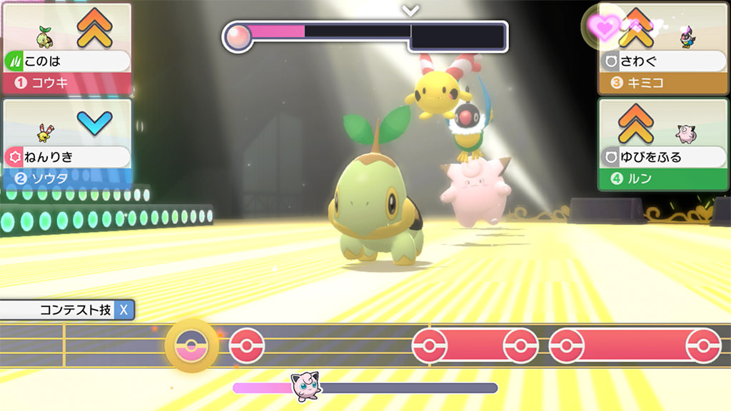 「かっこよさ」「うつくしさ」といったポケモンのコンディションと、ボールデコのエフェクトが評価の基準となる審査。それらを各部門に合わせておくことで良い評価がもらえ、会場が盛り上がるぞ。コンディションは、ポケモンにポフィンを与えることで上げることができるので、ボールデコとあわせて入念な準備を行ってから臨もう!