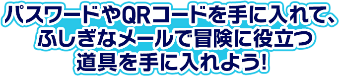 ゲームを進めていくとトップメニューに追加されるようになる「ふしぎなメール」から、テレビや雑誌など、いろいろなところで公開されるパスワードやQRコードを入力すると、冒険に役立つ道具を手に入れたり、新たなダンジョンに挑戦できたりするよ! ふしぎなメールで挑戦できるダンジョンは、通常のプレイでは現れない特別なものだよ!