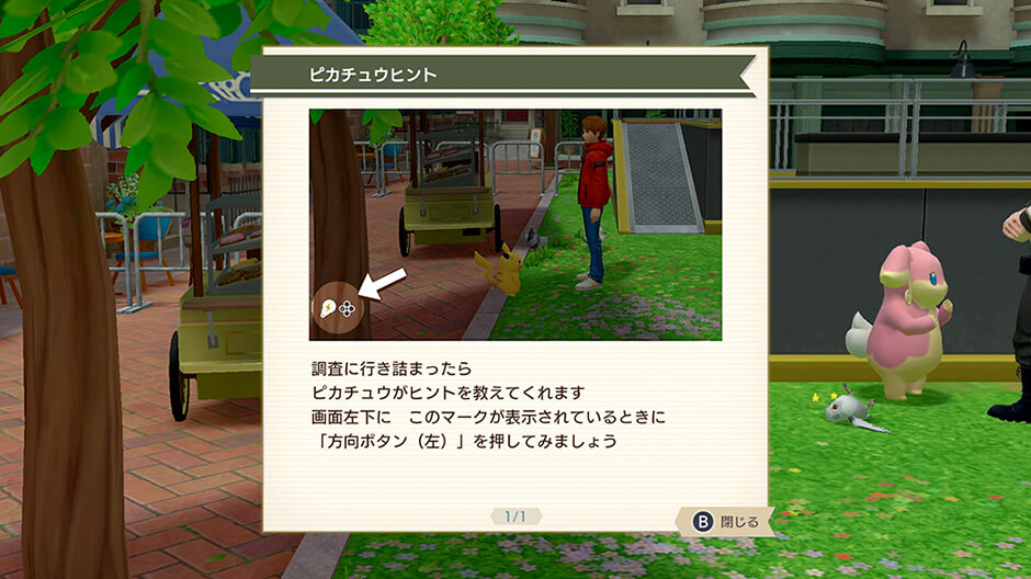 「聞き込み」は調査のキホン。人間だけではなく、ピカチュウを通じてポケモンからも情報を集めることができるぞ。