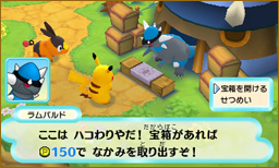 ダンジョンで見つけた宝箱を持って行くと、ラムパルドが自慢の頭突きで開けてくれるのだ。宝箱の中からは、冒険に役立つどうぐや、チームスキルが手に入ることもあるぞ! チームスキルを集めれば集めるほど、冒険が有利になるぞ!