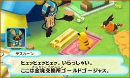 デスカーンの「ゴールドゴージャス」では、きんかいを様々などうぐやおかねに換えてくれる。珍しいわざマシンや、ダンジョンの扉を開けるための鍵と、交換することができるのだ!