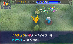 ポケモンごとの「ギフト」を作ってもらうことができる、チラチーノの「ギフトショップ」。ダンジョンの中で、敵ポケモンにこのギフトをプレゼントすることで、確実に仲間にすることができるぞ!