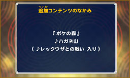 トップメニューの「ついかコンテンツ」や、宿場町にある「DLCコーナー」で、追加ダンジョンをダウンロードすると、過去に発売された「ポケモン不思議のダンジョン」シリーズ、『ポケモン不思議のダンジョン 青の救助隊・赤の救助隊』や、『ポケモン不思議のダンジョン 時の探検隊・闇の探検隊・空の探検隊』の楽曲も聞くことができるようになるぞ!