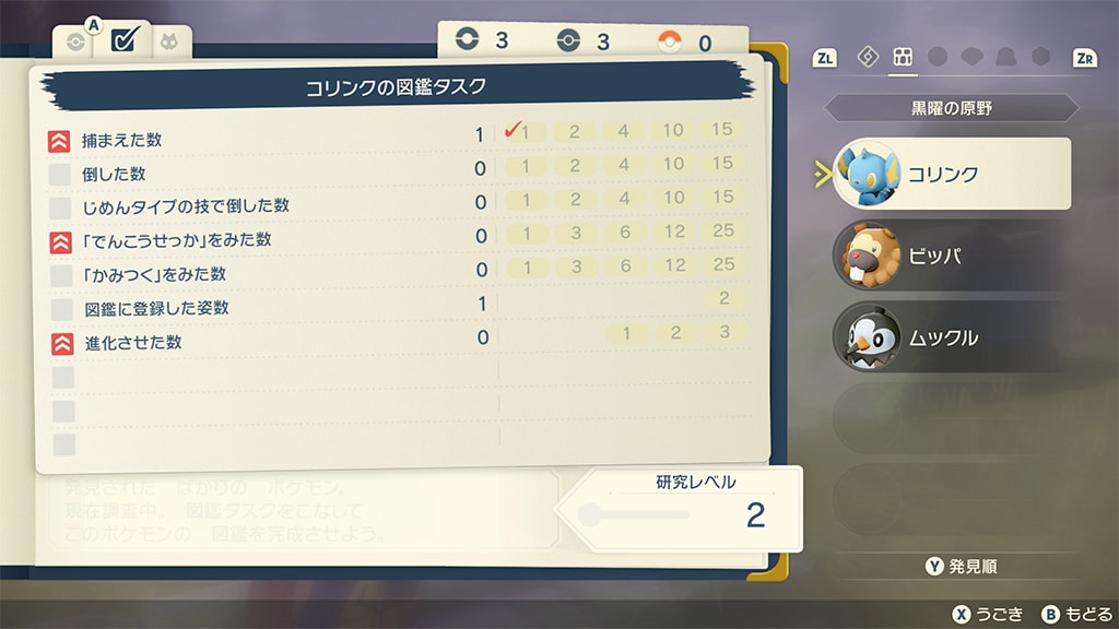 研究レベルはポケモンの生態を観察したり、進化させたりすることで上がり、図鑑に書かれている内容がより充実していく。