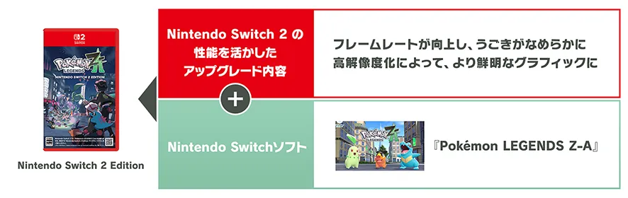 『Pokémon LEGENDS Z-A』は、 Nintendo Switch版に加え、Nintendo Switch 2 向けの『Pokémon LEGENDS Z-A Nintendo Switch 2 Edition』も発売いたします。Nintendo Switch 2 のスペックを活かし、グラフィックやフレームレートの向上などにより、ミアレシティでの冒険をより快適に楽しむことができるNintendo Switch 2 ソフトです。
