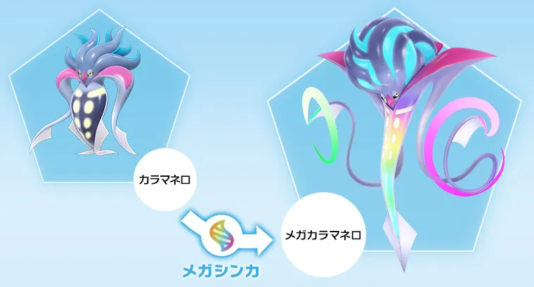 メガシンカによって脳が肥大化し、大幅に向上したサイコパワーは身体から溢れ、光り輝いています。この色鮮やかな光には、強力な催眠術の効果をさらに高める作用があり、人格や記憶までもを自在に書き換え、別人のようにしてしまうほどの恐ろしい力を持っています。