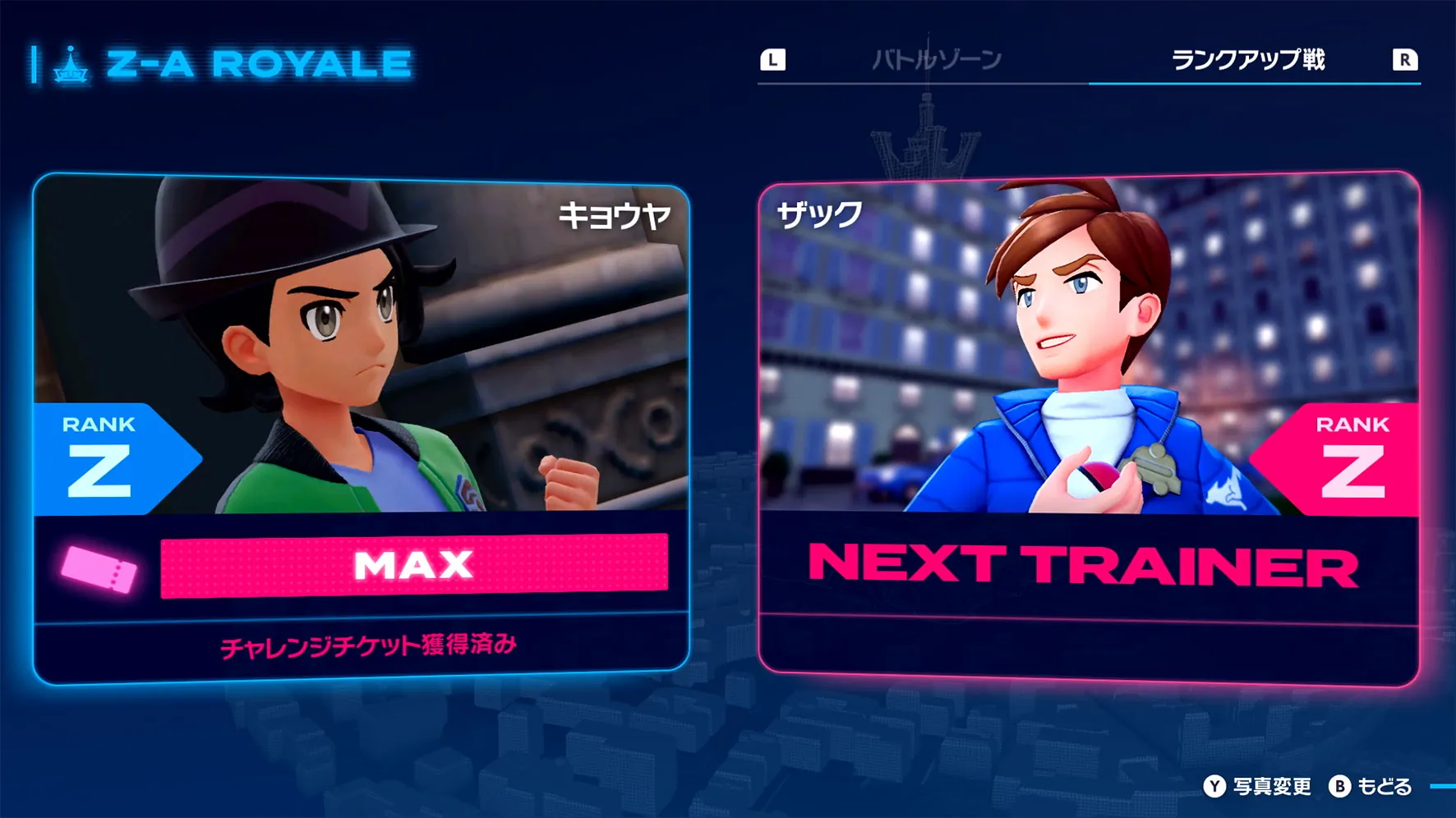 ZAロワイヤルでのランクを上げるためには、「ランクアップ戦」に挑み、勝利する必要があります。「ランクアップ戦」では、主人公と同じくランクアップを狙う手ごわいトレーナーと1vs1で勝負することになります。ポケモンたちをしっかりと育ててから挑みましょう。