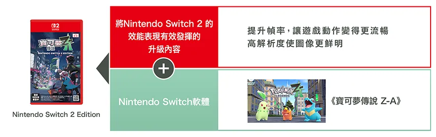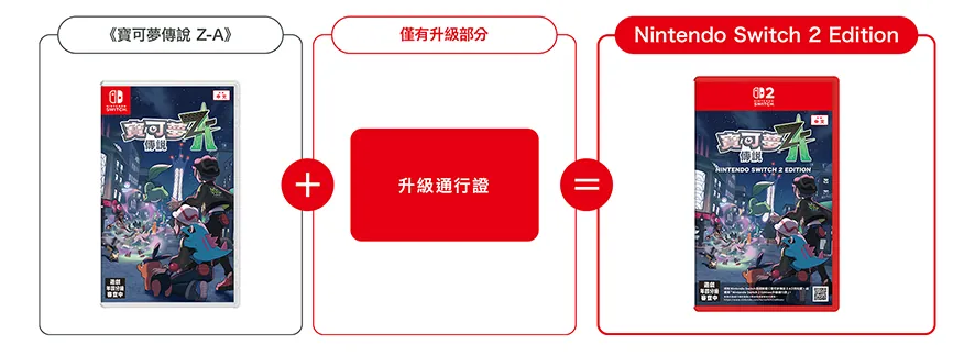 無論是《寶可夢傳說 Z-A》盒裝版或下載版任一版本,僅需購買升級通行證便能升級為Nintendo Switch 2 Edition。升級通行證可於Nintendo eShop或My Nintendo Store上購買。