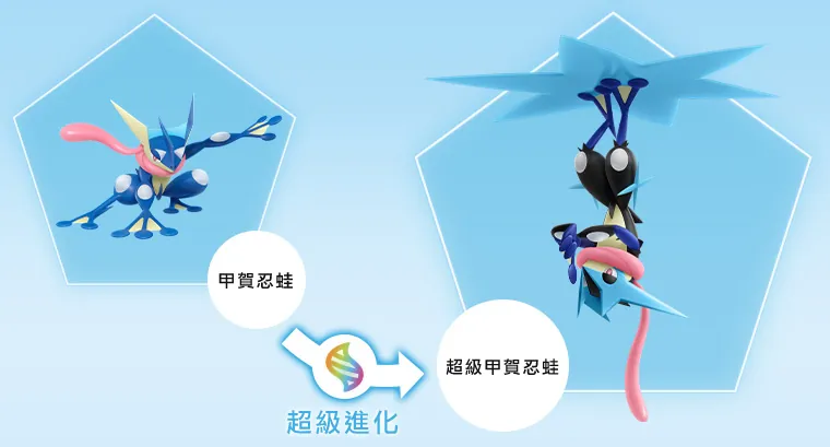 隨著超級進化的能量解放,反射速度有了顯著的提升。刻意現身使對手不得不攻擊,並在察覺到攻擊的氣息後,比對手更快進攻。曾經像忍者般神出鬼沒的甲賀忍蛙因超級進化而主動現身,這意味著牠必勝的決心。
