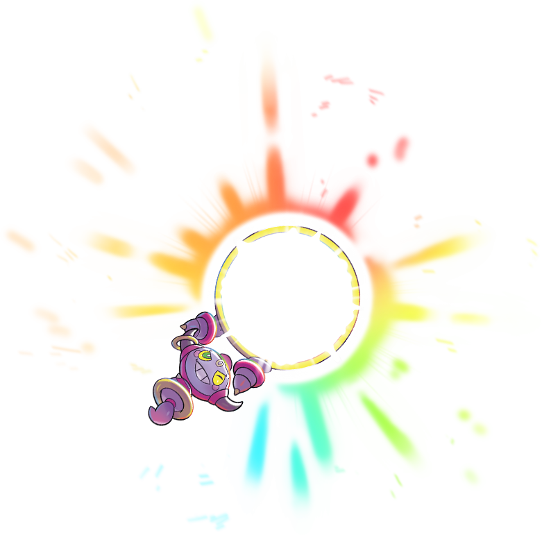 ツノや胴体のリングを使って、空間をゆがめる能力を持つ幻のポケモン。リングは伸縮自在で、その内側は離れた別の場所に通じる穴となり、その穴に入るとあらゆるものが一瞬にして移動できます。
