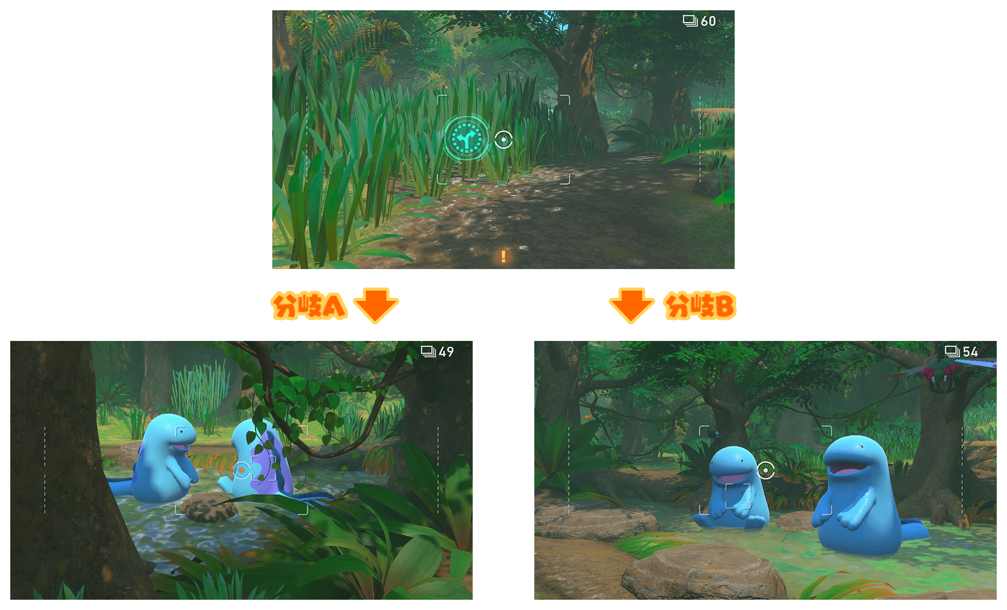 また、写真を撮って調査を進めていくことで、ルートの調査レベルが上がっていく。調査レベルが上がると、ポケモンの新しい表情やしぐさが見られるようになるかもしれないぞ!たくさん調査へ出ることで、新たな出会いや発見が主人公を待っているぞ。