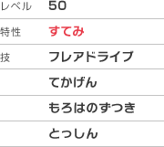 「すてみ」は、反動を受ける技の威力を上げる効果を持つ特性です。威力120の技「フレアドライブ」のように、反動を受ける技は高い威力を持つものが多いですが、特性「すてみ」を活かして、さらに大ダメージを狙っていけます!