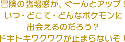 トレーナーが連れているポケモンや、フィールドを横切るポケモン。冒険中のポケモンとの出会いかたは多様だ。「ずかんナビ」を使えば、そんな日常に存在するポケモンたちも、ポケモンずかんに「みつけたポケモン」として登録していくことができるぞ!