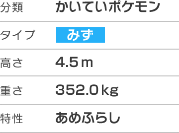 空一面を覆う雨雲を作りだし、大雨を降らせて海を広げたといわれているポケモン。グラードンとの死闘の末、海底で長い眠りについたといわれている。