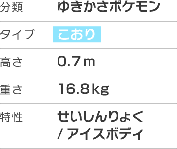 メガシンカすることで、こうげき・とくこうが大幅にアップ。また、すばやさも上昇した。特性は、ノーマルタイプの技がこおりタイプになる「フリーズスキン」に変化。ノーマルタイプの技を、高威力で放てるぞ。