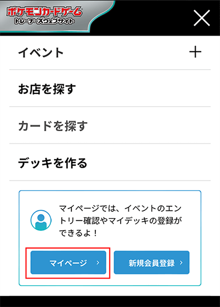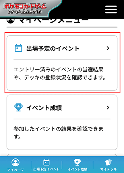 - ①当選者ご本人のスマートフォン等モバイル端末より、プレイヤーズクラブのマイページにログイン後、「出場予定のイベント」に移動し、「ポケモンジャパンチャンピオンシップス2024 一般観覧」のページを開く。