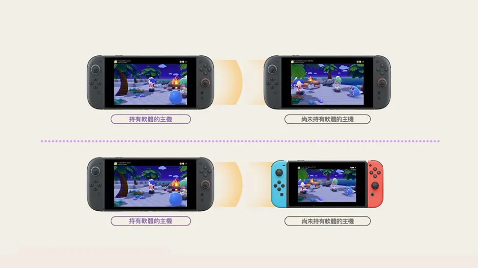 只要有Nintendo Switch 2和1份軟體,就可以使用「遊戲分享」將遊戲分享給尚未持有該軟體的人一起遊玩。