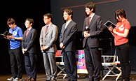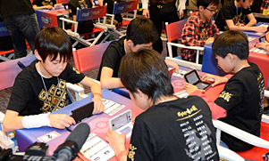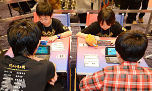 当日は、会場に駆けつけてくれた若手棋士たちによる、『ポケットモンスター X・Y』のエキシビションマッチも行われたよ! 阿久津主税(あくつちから)八段、野月浩貴(のづきひろたか)七段、中村太地(なかむらたいち)六段、田中悠一(たなかゆういち)四段の4人が大激突!!