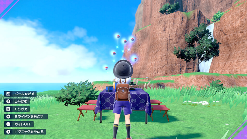 ピクニックを始めると、手持ちのポケモンや、一緒に冒険している伝説のポケモンであるコライドン/ミライドンがフィールドに勢ぞろいします。