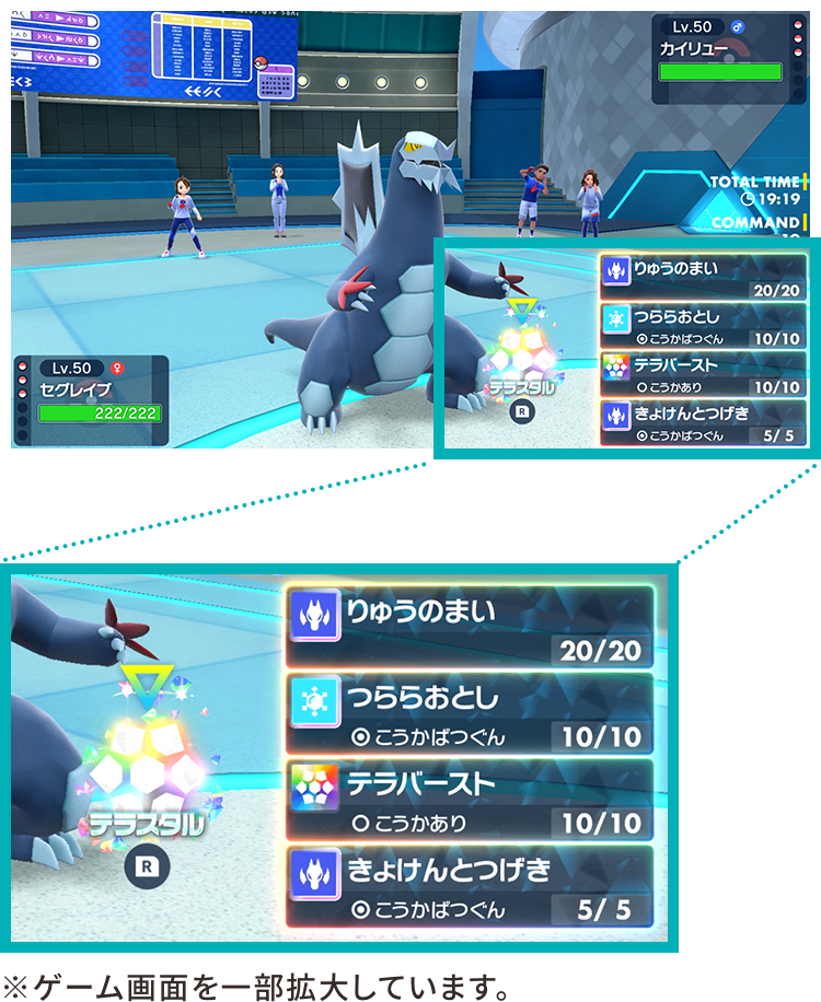 『ポケットモンスター スカーレット・バイオレット 』で登場した「テラスタル」は、ポケモンが宝石のようにキラキラと輝きながら特別な力を手に入れる現象で、バトルでも重要な役割を果たします。「テラスタル」することでポケモンのタイプが「テラスタイプ」に変わり、一致するタイプの技の威力を上げたり、弱点のタイプを変えたりしながら、戦略の幅を大きく広げることができます。