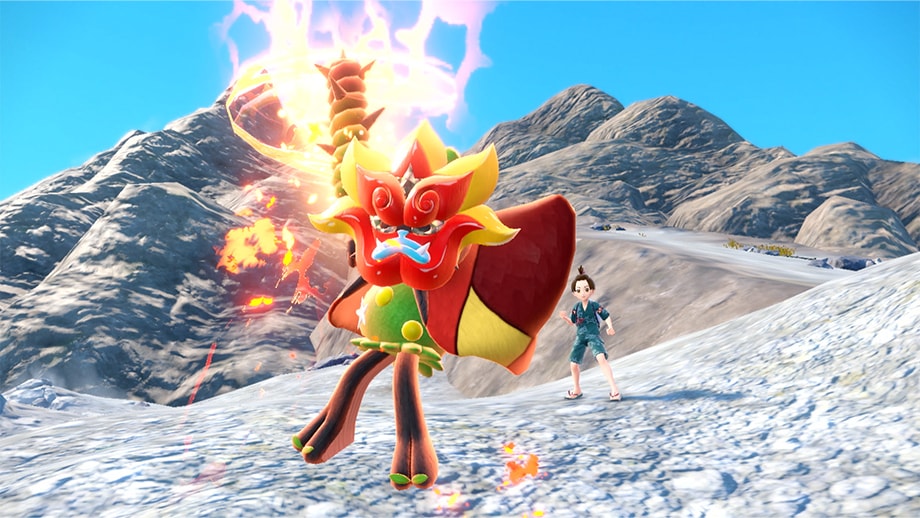 くさ・ほのおタイプのすがたです。かまどで燃えさかる炎のように激しく相手を攻めたて、もっとも攻撃的です。