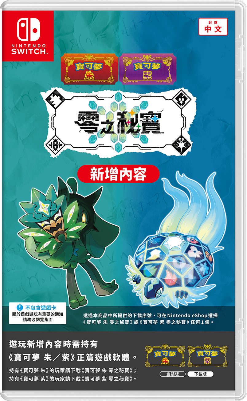 《零之秘宝》分为《宝可梦 朱 零之秘宝》和《宝可梦 紫 零之秘宝》2种软件。玩家购买的软件会根据所持的是《宝可梦 朱》还是《宝可梦 紫》而有所不同。拥有《宝可梦 朱》的玩家请购买《宝可梦 朱 零之秘宝》。拥有《宝可梦 紫》的玩家请购买《宝可梦 紫 零之秘宝》。如果购买了相反的组合将无法游玩。敬请注意,以免买错。