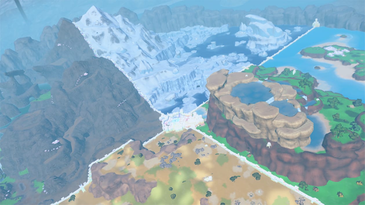 生態巨蛋中共有4個區域,各個區域都有著不同的地理特色和氣候,形成了各式各樣的自然環境。投影在生態巨蛋的牆壁與圓頂的人工天空,也會隨著時段和天氣展現出各種風貌。同時,各個區域的氣溫都受到嚴格的控制,隨著區域不同,棲息的寶可夢也截然不同。