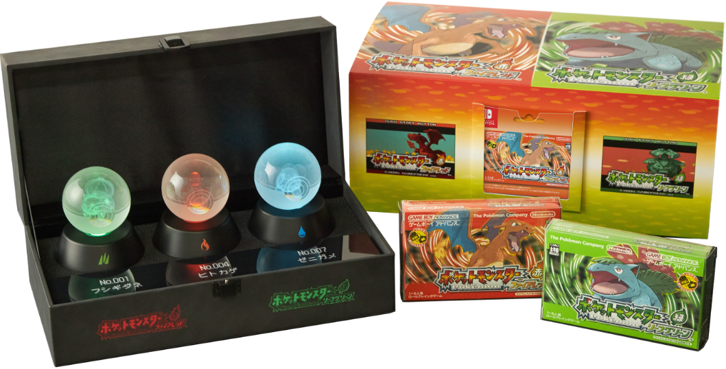 特別版のバージョンでの違いはダウンロードカードのみで、そのほかの特典は両バージョンで共通です。特別版のバージョンにかかわらず、『ポケットモンスター ファイアレッド・リーフグリーン』のどちらの再現パッケージも封入されます。再現パッケージには、ゲームボーイアドバンス専用ソフトや説明書等の内容物は付属していません。