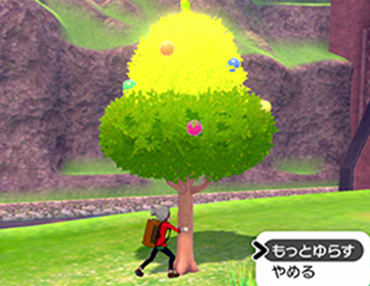ガラル地方のさまざまな場所には、きのみの取れる木が生えている。この木を何回も揺らすと、きのみだけではなく、ポケモンも落ちてきて、手に入るきのみが減ることがあるから、気をつけよう!