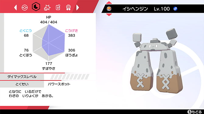 イシヘンジンの特性「パワースポット」は、イシヘンジンが「パワースポット」となることで、味方のポケモンが繰り出す技の威力を上げる。マックスレイドバトルでは、イシヘンジンがいればいるほど、味方のポケモンが繰り出す技の威力が上がっていくぞ!