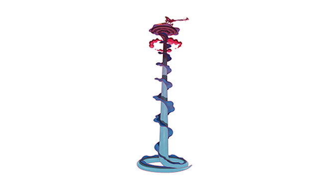 キョダイマックスにより、非常に長い尻尾を手に入れた。その長さは40mほどといわれ、キョダイマックス中は柱のように垂直に伸ばして、その上に座り、臨戦態勢をとる。明晰な頭脳で、重力による弾道の降下を計算することで、驚異的な狙撃を行うぞ。