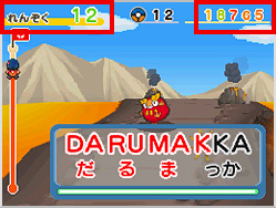 連続でタイピングに成功すると、得点がどんどんアップしていく。高得点をねらうには、スピードと正確さが重要になるぞ。