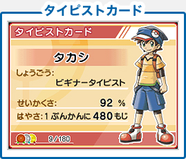今までかくとくしたメダルの数は、「タイピストカード」で確認できる。このメダルの数に応じて、称号(しょうごう)が変わっていくぞ。