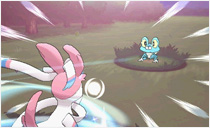 『ポケットモンスター X・Y』で新たに登場した、フェアリータイプの技「ムーンフォース」(2番目の画面)。月のパワーを借りて、相手を攻撃する。高い威力を持つうえに、相手の攻撃力を下げることもある、非常に強力な技だ。