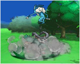 ジャンプ力に磨きがかかり、600メートルのタワーも1分で登り切る。バトルでは、木々や天井などを使って飛び回り、相手をかく乱する戦法を得意とする。さらに、泡で包んだ小石を投げて攻撃するのだ。