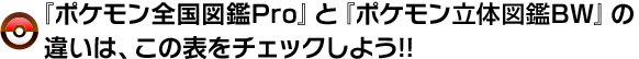 『ポケモン全国図鑑Pro』と『ポケモン立体図鑑BW』の違いの表