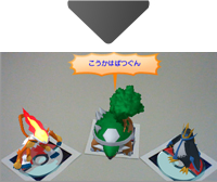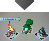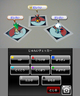 ポケモンARマーカーを複数用意し、比較したいポケモンを同時に表示。能力のボタンをタッチしてアイテムを投げれば、その能力の順位が表示される。ポカブの攻撃がいちばん高いことが、ひと目でわかるぞ!
