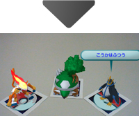 ポケモンARマーカーで写したポケモンに向かって、ほのおタイプのボタンをタッチして、アイテムを投げたぞ! 当たったポケモンには、投げたアイテムのタイプと同じ技を使ったときの効果が表示されているぞ!
