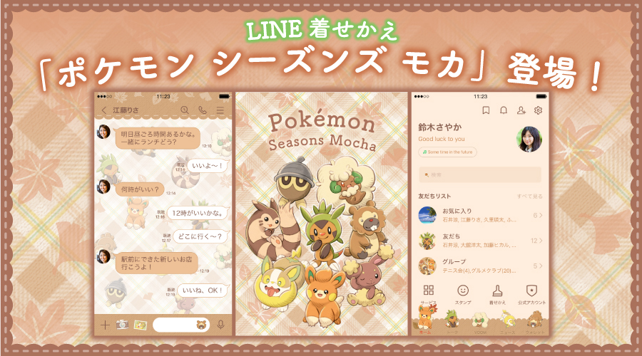 LINE株式会社が運営するコミュニケーションアプリ 「LINE(ライン)」 内の着せかえショップにて、「ポケモン シーズンズ モカ」が発売中! ブラウンを基調としたポケモンたちの、秋らしくてかわいいLINEの着せかえだよ。柔らかなデザインで描かれたポケモンたちが、LINEをかわいくおしゃれに飾ってくれるよ! くわしくは、着せかえショップをチェックしてね!