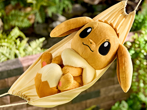 ハンモックでひなたぼっこをするピカチュウとイーブイのぬいぐるみやピカチュウのランタン型のライトをはじめ、アウトドアにピッタリの特大サイズのマルチバッグやモンスターボールプレートなどのグッズが勢ぞろい!