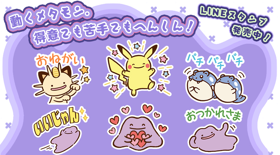 LINEヤフー株式会社が運営するコミュニケーションアプリ 「LINE(ライン)」 アプリ内のスタンプショップにて、ポケモンのLINEスタンプ「動くメタモン。得意でも苦手でもへんしん!」が発売中! いろいろなポケモンに変身するメタモンのスタンプが登場したよ。顔だけメタモンのまま残ってしまっているスタンプも! さまざまな表情を楽しもう。 くわしくは、スタンプショップをチェック!