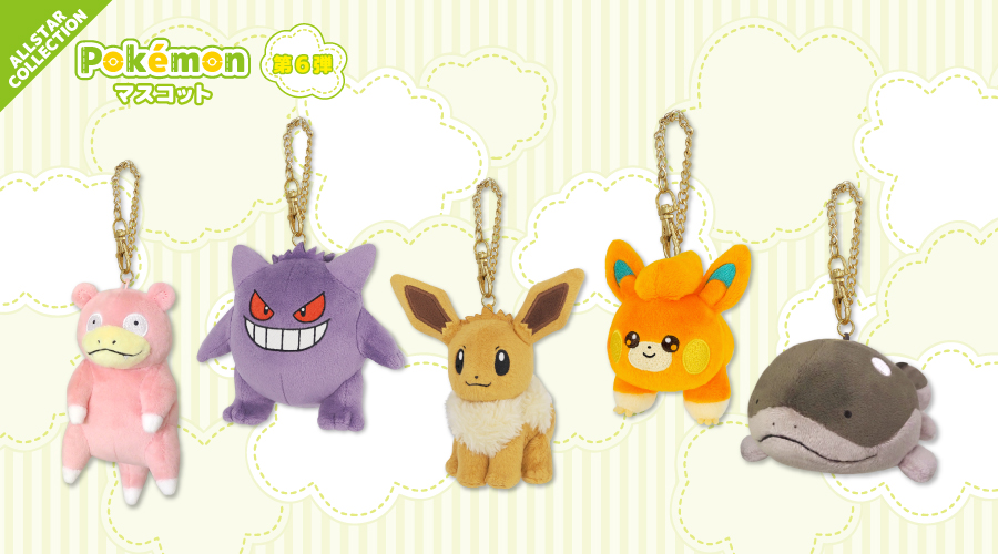 三英貿易株式会社より、オールスターコレクションマスコットシリーズに第6弾が登場! おなじみのヤドン・ゲンガー・イーブイのほか、パルデア地方で活躍するポケモンのパモ、ドオーが仲間入りするよ!