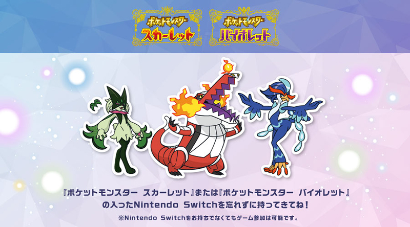 Nintendo Switch本体と、Nintendo Switchソフト『ポケットモンスター スカーレット』『ポケットモンスター バイオレット』のいずれかをポケモンセンターに持ってきて、ぜひ参加してみてね! まだNintendo Switchや『ポケットモンスター スカーレット・バイオレット』を持っていなくても、参加できるよ。