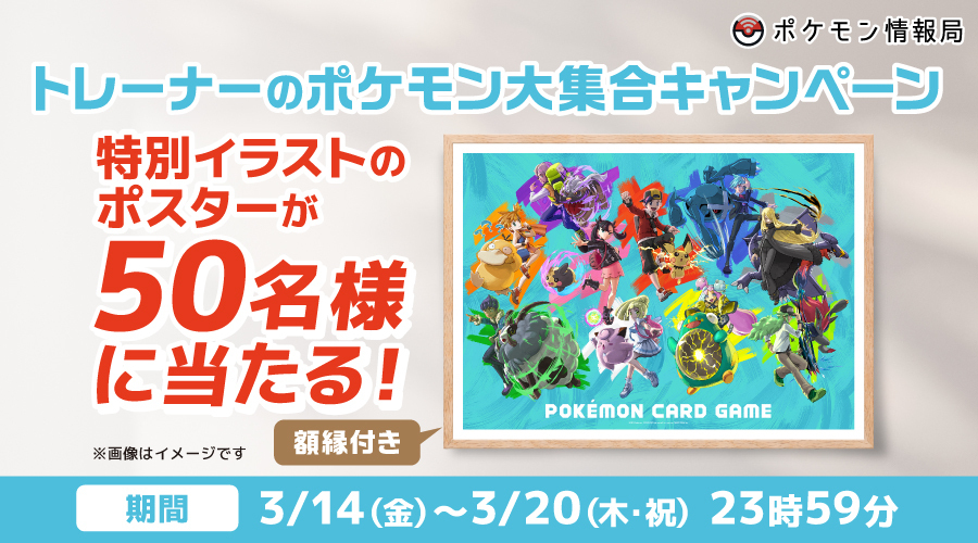 「ポケモン情報局」をフォローし、対象ポストをリポストしてくれた方の中から抽選で50名様に、ポケモンカードの特別イラストのポスターをプレゼントするよ。