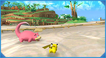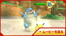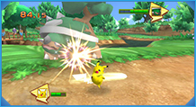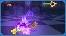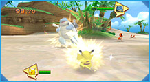 「バトル」では、制限時間内にダッシュでぶつかったり、わざを当てたりして、相手の体力をなくせば勝利となるぞ! ピカチュウが得意とする「10まんボルト」や「アイアンテール」などを使って、はく力の「バトル」を楽しもう!