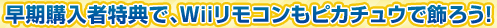早期購入者特典として、イラストが立体的に見える「Wiiリモコン ピカチュウ3Dステッカー」をプレゼント! ゲームでも大活躍の、ピカチュウがデザインされたステッカーをWiiリモコンにはってプレイして、さらに気分を盛り上げよう!
